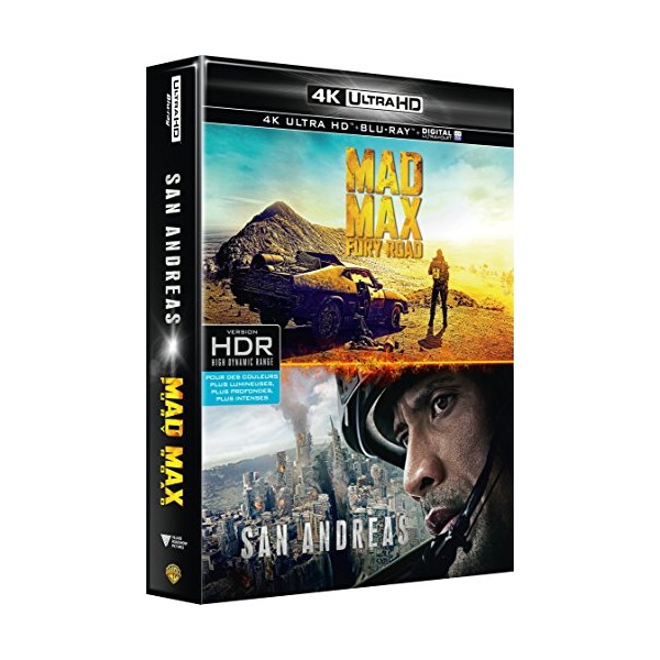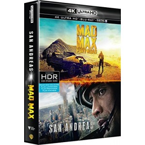 Contient : - "Mad Max : Fury Road" (Ultra HD Blu-ray 4K en HDR + Blu-ray standard) - "San Andreas" (Ultra HD Blu-ray 4K en HDR + Blu-ray standard) Mad Max : Fury Road Blu-ray : "Furie maximum : le tournage de Fury Road" (29') "Mad Max : la furie sur quatre roues" (23') "Les Guerriers de la route : Max et Furiosa" "Les cinq épouses : Belles comme le jour" "Les outils du désert" "Fury Road : Accident et collision" Scènes coupées San Andreas Blu-ray : Commentaire audio de Brad Peyton "San Andreas : la faille réelle" "Dwayne Johnson le sauveur" "Mesurer la secousse" Scènes coupées Bêtisier |