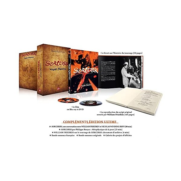 | Film en version restaurée HD Édition Ultime Contient : - le Médiabook avec Blu-ray, DVD et livret 50 pages inclus - la reproduction du script original annoté par William Friedkin (164 pages) "Sorcerers" : un entretien entre William Friedkin et Nicolas Winding Refn (80') "Métaphysique de la peur" : Philippe Rouyer à propos de Sorcerer (25') William Friedkin sur le tournage de Sorcerer : document d'archives (6') Bande-annonce française Bande-annonce originale Galerie des projets d'affiches |